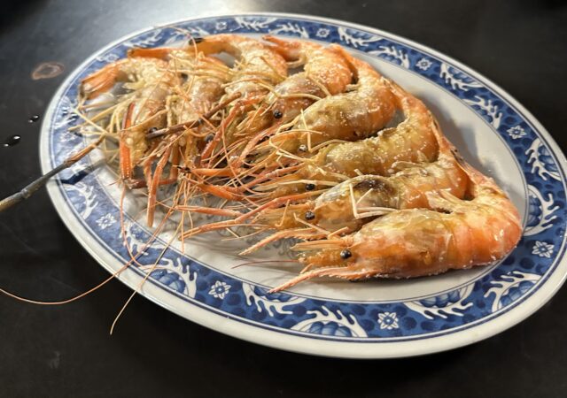 釣ったエビは奥のコンロで塩焼きにしてもらい、その場で食べました。