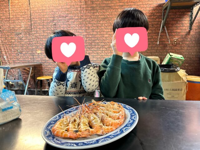 エサをつけたり、釣れたエビから針を外したりは大人の仕事で、子供は竿を持ってエビがかかるのを待っているだけですが、わくわく感がすごくてとても楽しかったようです。台湾旅行の中で一番楽しかったと絵日記に書いてました。