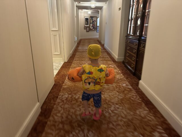大人はバスローブを羽織りましたが、子供たちはショートパンツ型の水着にラッシュガード着用で洋服とあまり変わらない姿だったので、そのまま行きました。