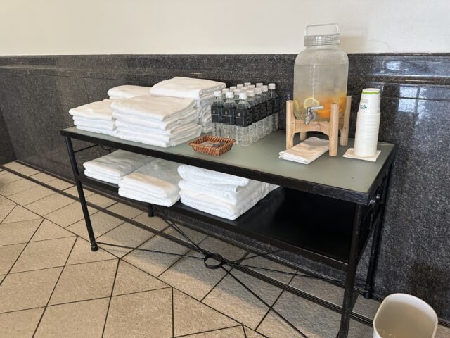プールエリアの一角に、タオルやミネラルウォーター、デトックスウォーター、ヘアゴムなどが常備されており、必要なときはすぐに使えました。