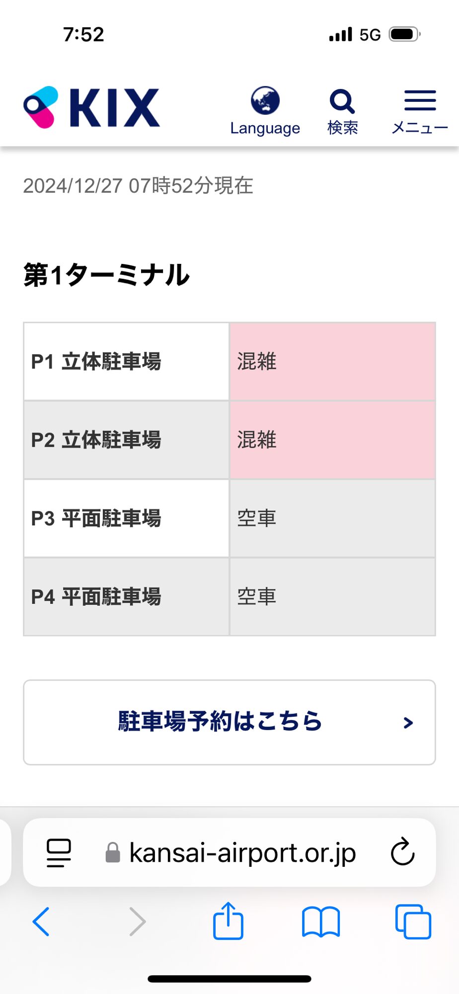 空港内駐車場の予約はとれませんでしたが、多くの人が冬休みとなる12月28日(土)の前日27日(金)出発だったため、まあ空いているだろうとの判断です。