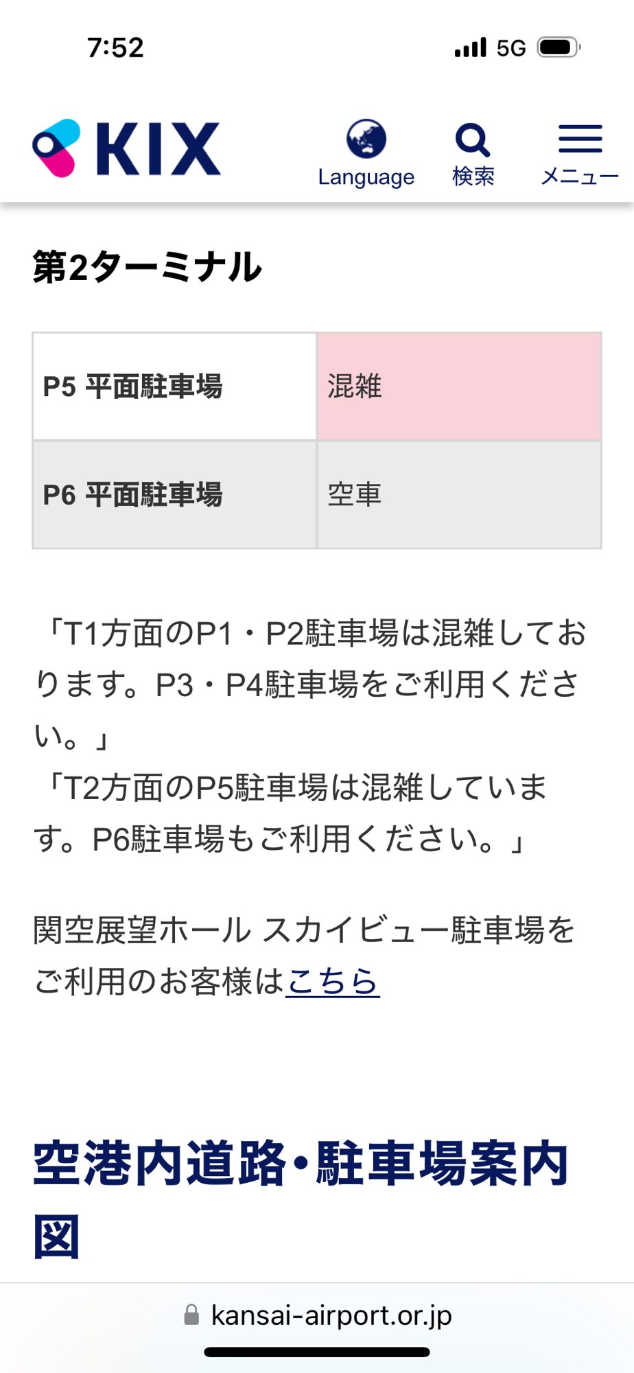 当日の駐車場の利用状況はこのような感じで、第1ターミナル・第2ターミナルとも混雑はしているけれど満車にはなっていませんでした。わが家はpeach利用だったので、第2ターミナルのP5平面駐車場に停めました。