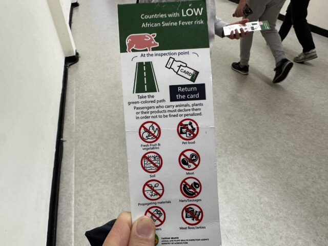飛行機を降りたところで配布されるこちらのカードは、動物検疫が免除されるカードだそうで、あとから出口で回収されるまで持っておく必要があります。