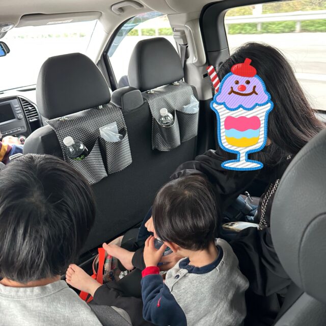 上の子一人のときはレジャーシート・新しいおもちゃ・本・ゲーム・酔い止めやら心配して過保護にいろいろ準備していましたが、今や適当になり、日ごろの持ち物とほとんど変わらずです‥笑