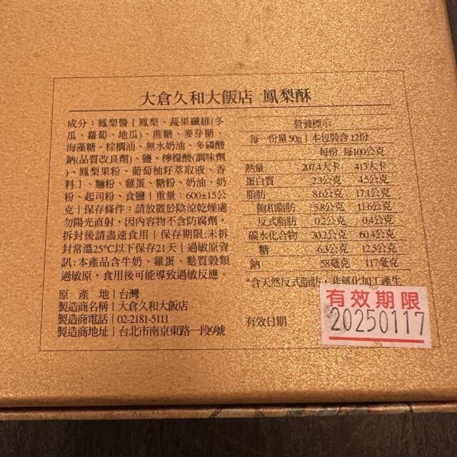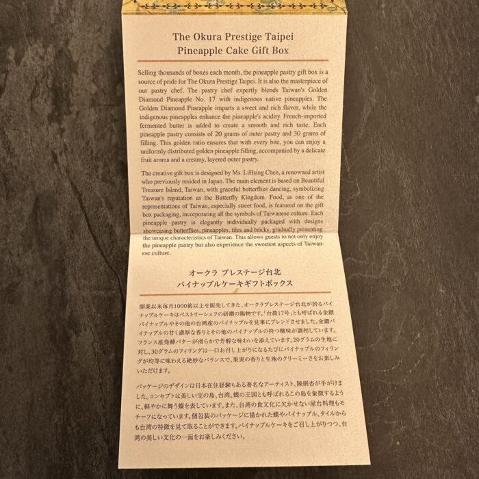 味は、バターの風味がしっかりしていて、まるで洋菓子のようなパイナップルケーキでした(フランス産の発酵バターが使用されているそうです)。